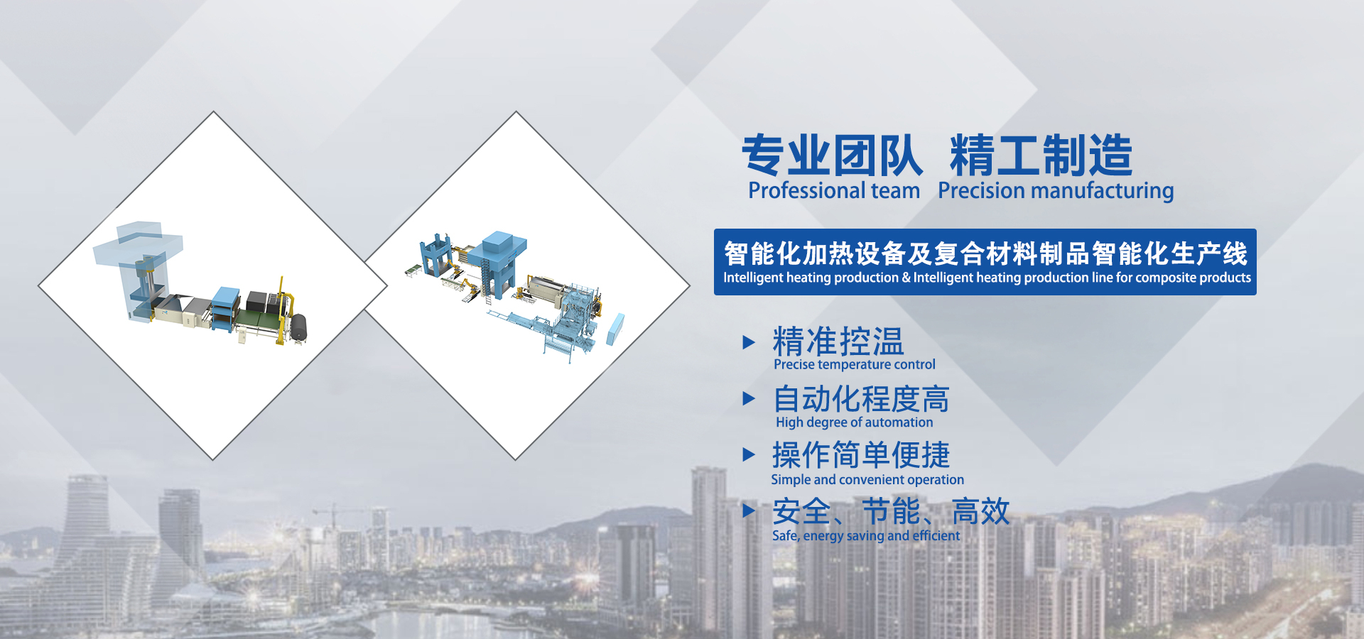 主營產品包括:遠紅外線烘箱、熱風循環烘箱、工業烘箱、固化爐、多層箱式烘箱、接觸式加熱機、多層接觸式加熱機、PET復合材料制品智能化生產線、LWRT輕型增強熱塑性復合材料制品智能化生產線、GMT玻纖氈增強熱塑性復合材料制品智能化生產線、LFT-D長纖維增強熱塑性復合材料制品智能化生產線、汽車地毯智能化加熱生產線、汽車頂棚智能化加熱生產線、汽車輪罩智能化加熱生產線、汽車內飾件智能化加熱生產線、新能源汽車電池上蓋及下殼體智能化生產線、SMC復合材料制品智能化生產線、HP-RTM/HP-CRTM復合材料制品智能化生產線、復合材料制品智能化加熱生產線、超聲波塑料焊接機、熱板焊接機、特氟龍帶復合機、鋼帶復合機、毛氈板料復合機、疊料機、生產線配套用自動化設備,如桁架上料機械手及框架上料機械手、自動上下料機、伸縮送料機、機器人自動上下料、端拾器、針刺組、料車、氣動馬達退料裝置、升降機構等。